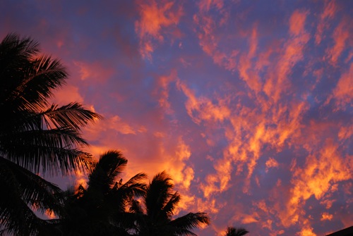 Joe bent down and a student presented him with a lei. Another presented a pointed wooden spear that looked at though the 5 pointed ends were singed from fire. I wondered if he had carved himself. A blond boy gifted him with a jar of preserved fruit, probably prepared by his mother. A coconut was offered to us. Coconut water tastes so refreshing when the outside temperature is 90+ ! We sipped the sweet water and ate sunset papaya. I took in the moment thinking about the preparation of picking flowers, papaya, and coconut.
